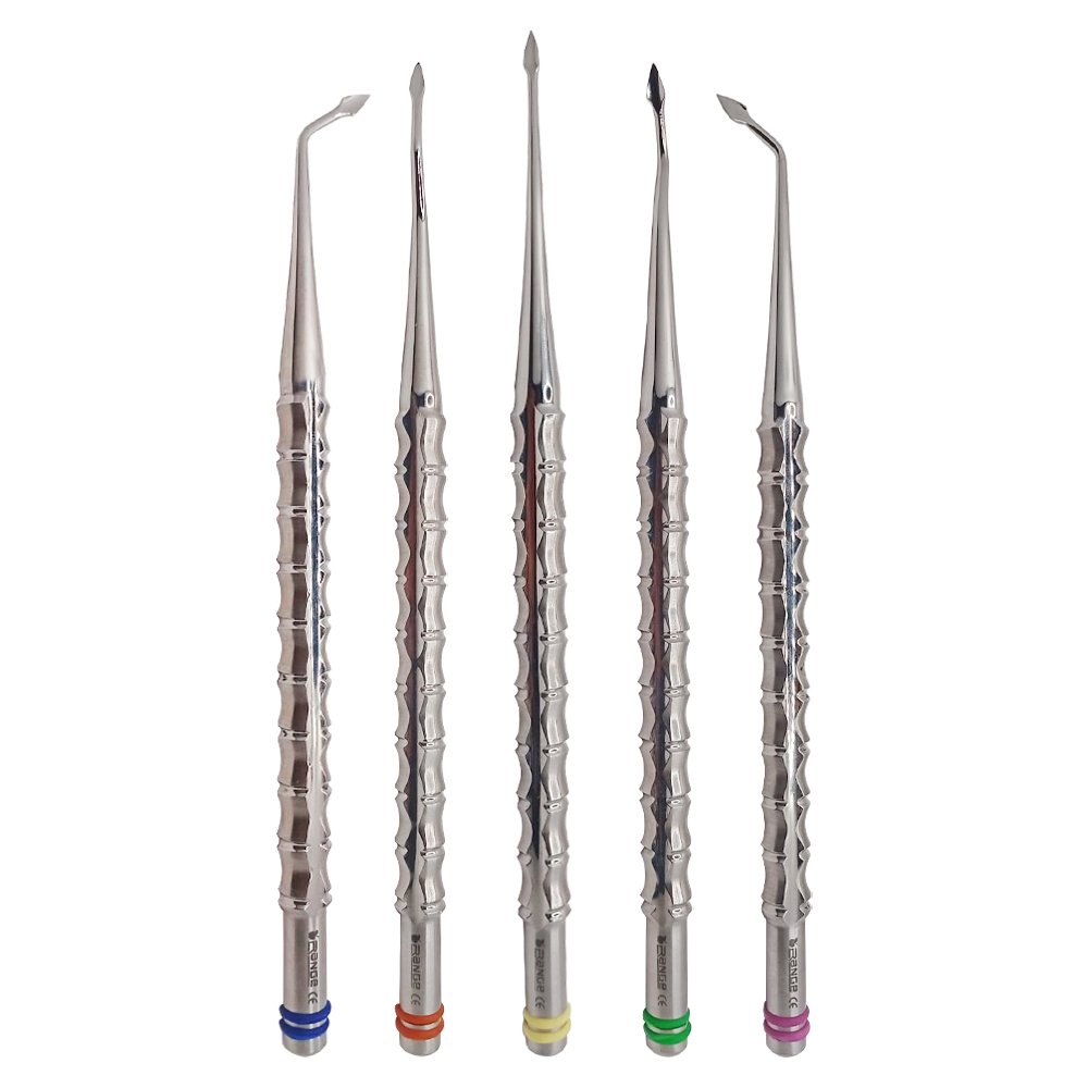 The X Tool Bernard Spade Elevators Set consists of five color-coded instruments, each designed with a specially balanced pencil grip for precision. These elevators are specifically designed for minimally invasive tooth extraction, enabling dentists to efficiently remove teeth while preserving surrounding bone and soft tissue. This approach facilitates immediate implant placement, reducing patient recovery time and discomfort. The set includes a complimentary sterilization cassette. Both the instruments and the cassette are fully autoclavable at 134°C.